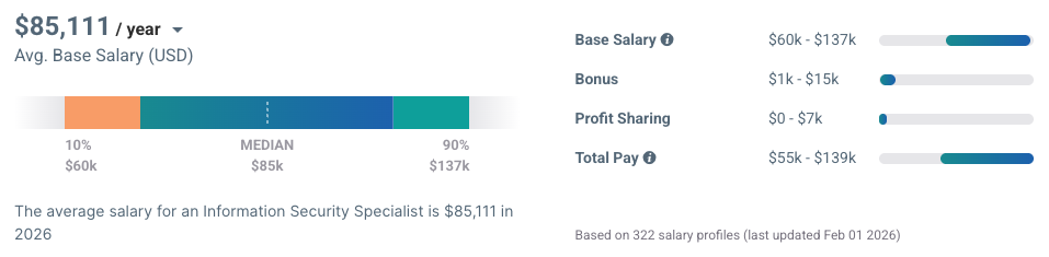 Payscale also reports that in 2026, cybersecurity specialists will be compensated across a wide range, depending on experience, responsibilities, and geography. The pay for a specialist ranges from $60,000 to $137,000. The average pay is $85,111.
