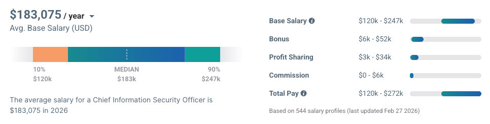 As of May 2024, information security analysts had a median annual salary of $124,910. Pay ranged from $69,660 for the lowest earners to $186,420 for the highest. While Payscale.com reports that chief information security officers make from about $112,000 to about $246,000 per year, with an average annual salary of $181,058.