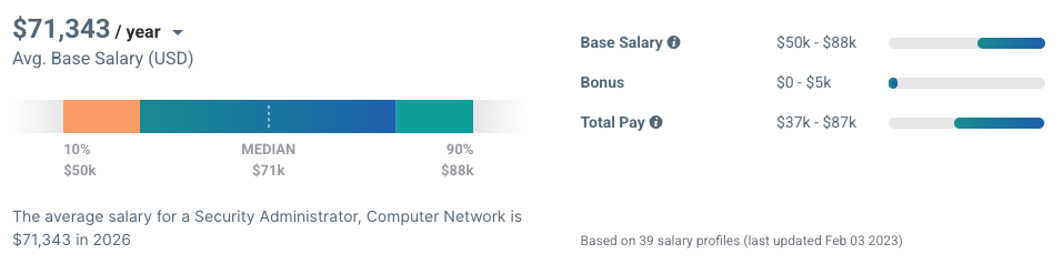 According to Payscale.com, security administrators are currently making from about $50,000 to about $88,000 per annum, with an average annual salary of $71,343 in 2025. Bonuses, commissions, and profit-sharing can add as much as $14,000 annually.
