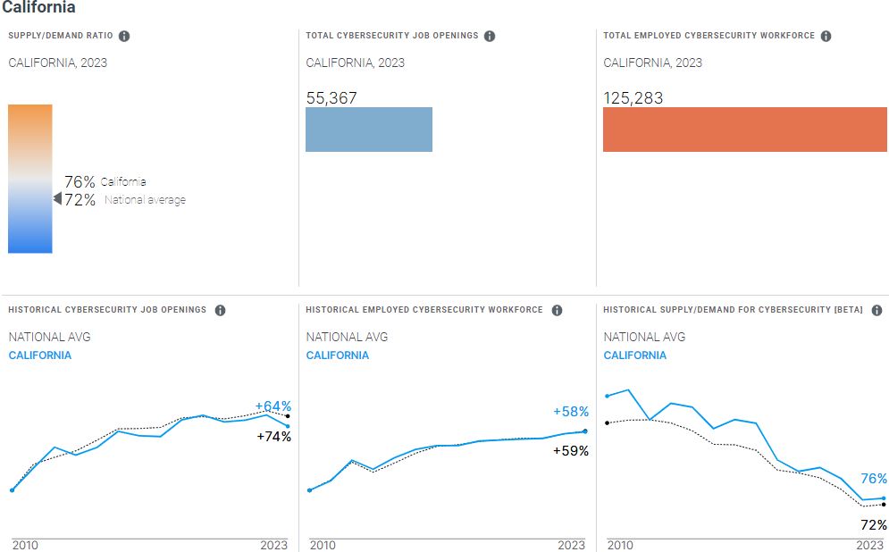 That being said, there is a nationwide job shortage of well-trained and experienced cybersecurity workers. The shortage is also being felt in California. At the state level, the workforce supply/demand ratio is almost at par with the nationwide ratio.