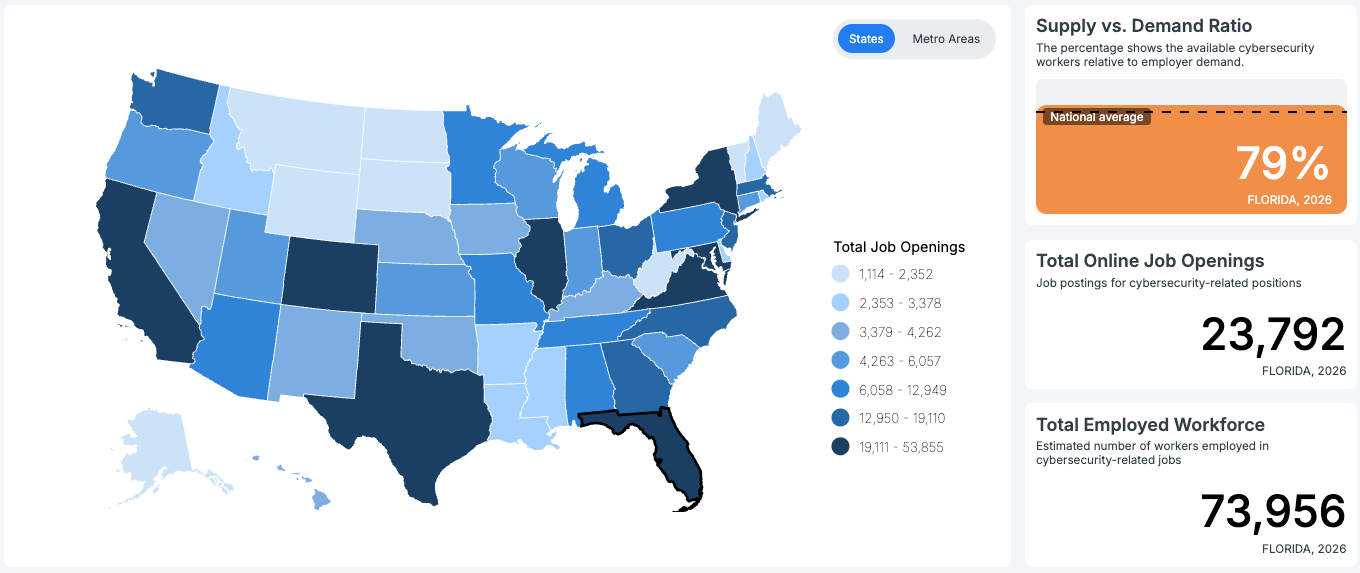 According to CyberSeek’s cybersecurity workforce analysis, Florida consistently reports thousands of cybersecurity job postings annually, indicating sustained demand for cybersecurity professionals.