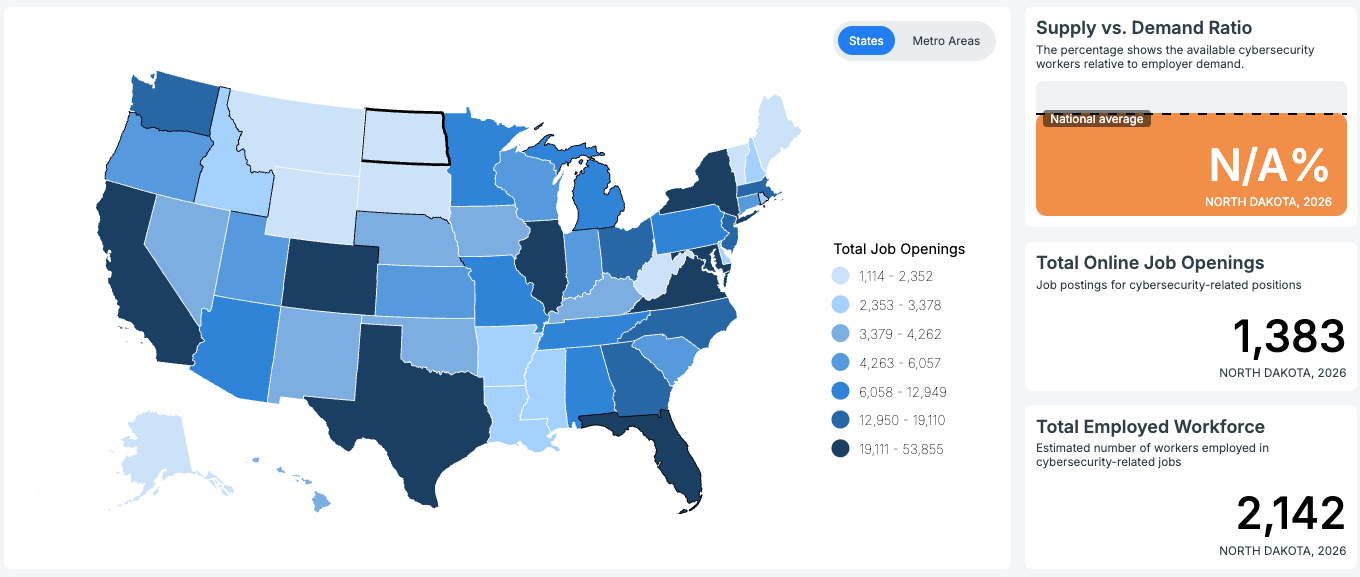 According to CyberSeek, North Dakota typically reports hundreds of cybersecurity-related job postings annually, reflecting steady employer demand across the state. CyberSeek data represents employer job postings and certification requests rather than total employment.